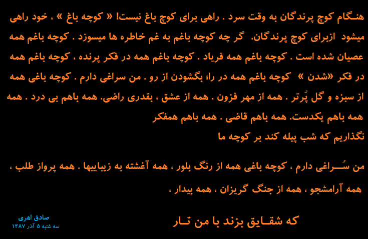 کوچه باغم همه فریاد . کوچه باغم همه در فکر پرنده